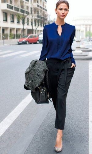 Funciona na perfeição quer em looks de trabalho quer em looks mais informais, porque estas cores complementa-se naturalmente.